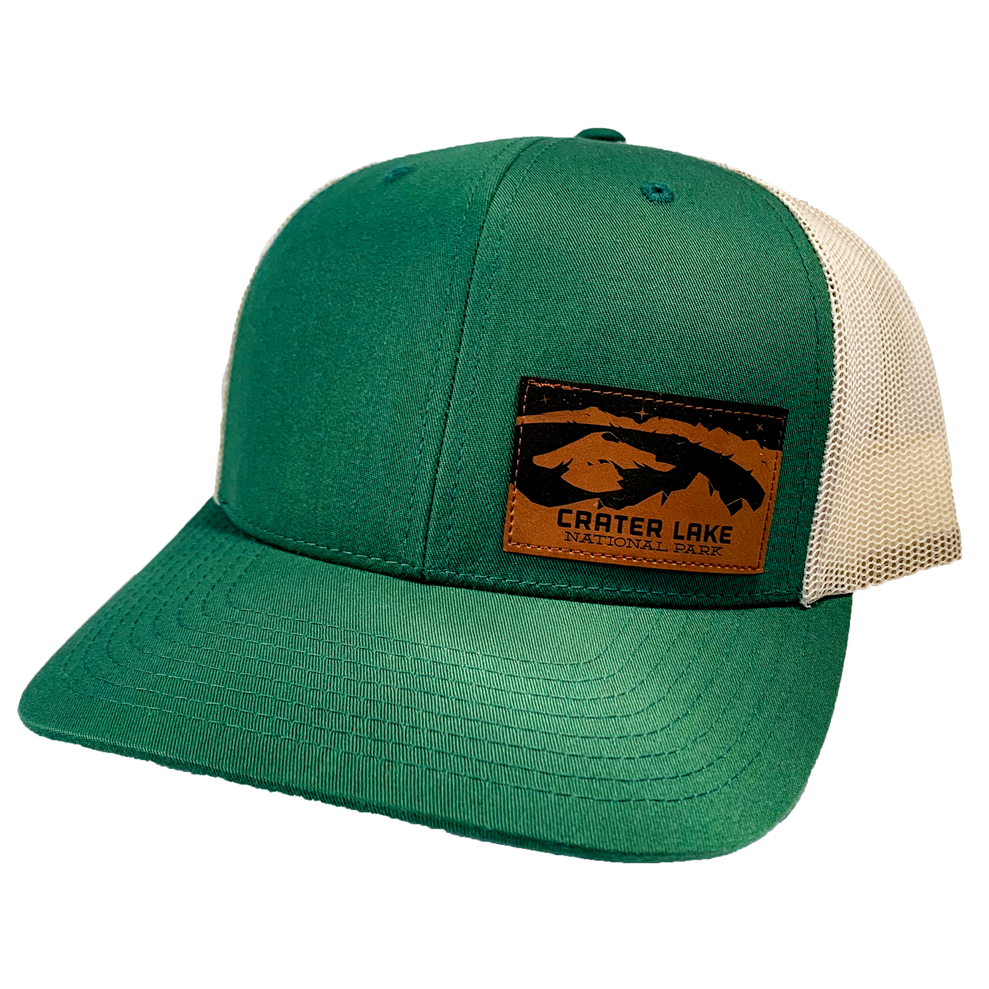 Classic snap back trucker hat with a vegan leather Crater Lake patch