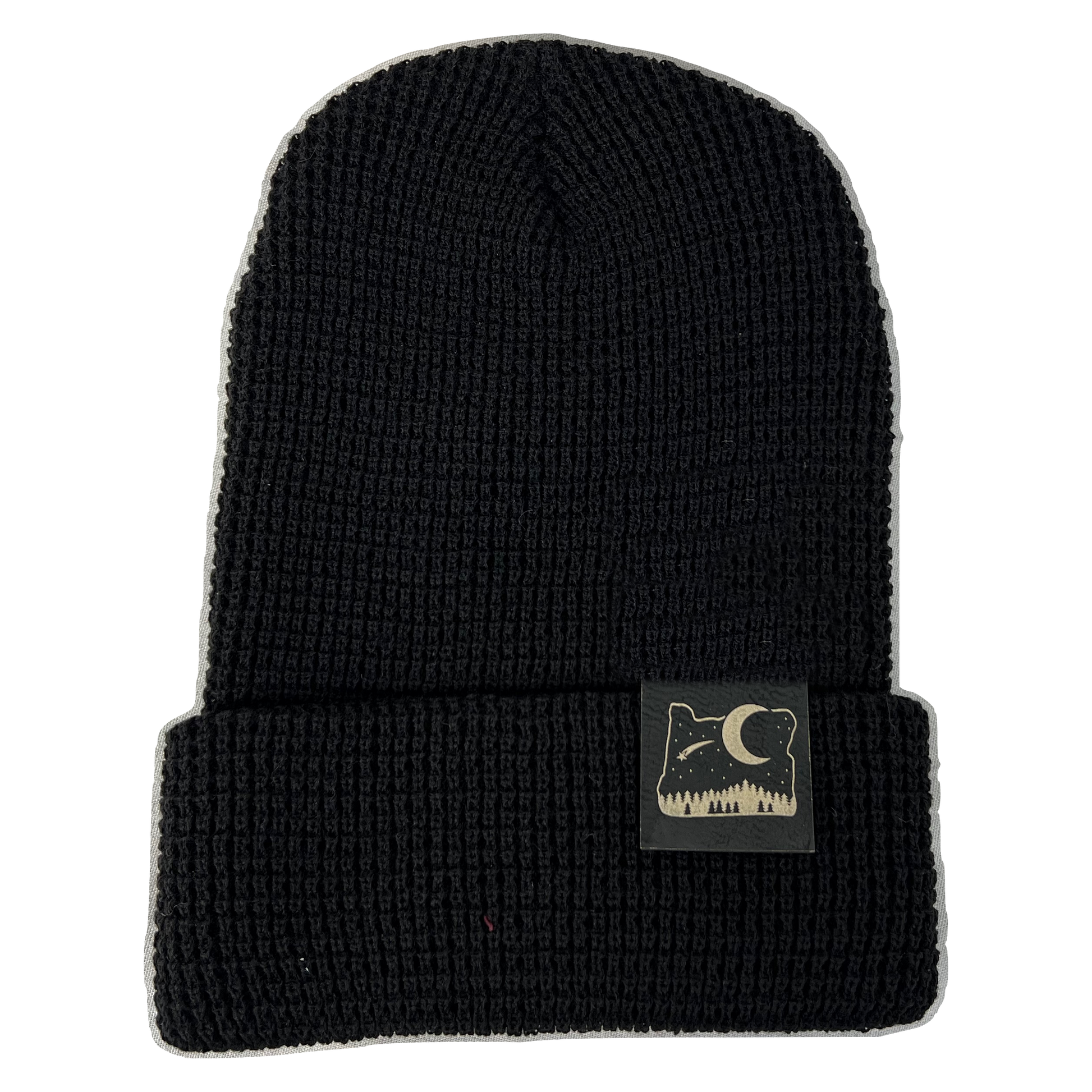 A classic mid depth beanie styled out with soft Waffle Knit, decorated with a vegan leather clip tag.