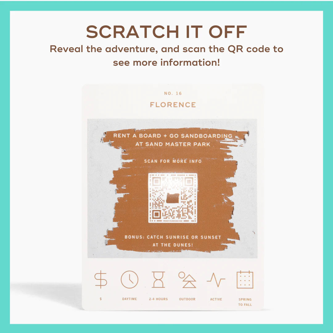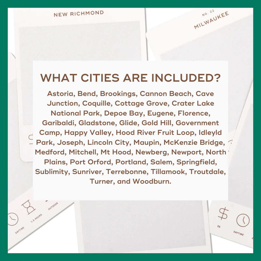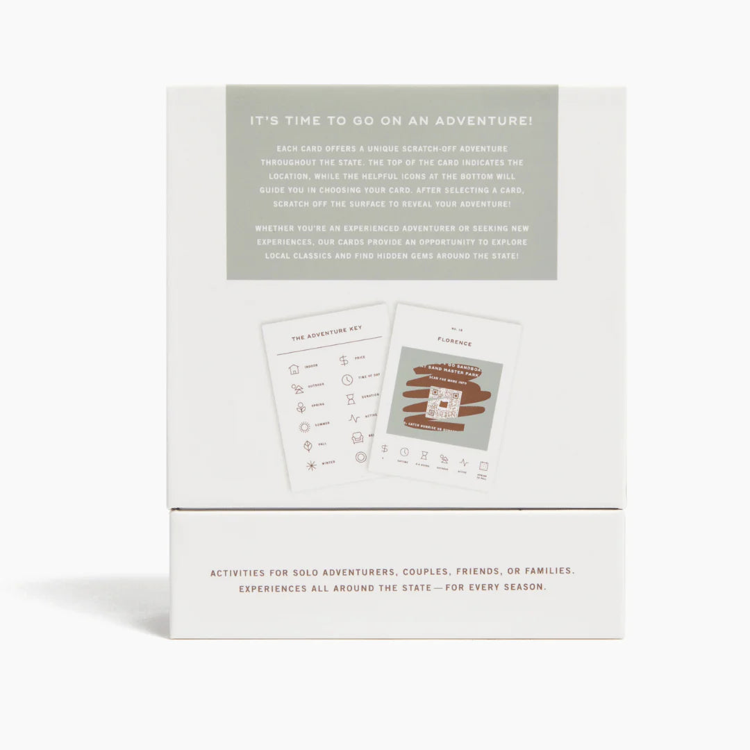 50 scratch off bucket list adventures around the state of Oregon. Pick a city that you want to explore, check out the icons at the bottom of the card to determine the season, cost, and time of day, and then scratch off the card to reveal your adventure!