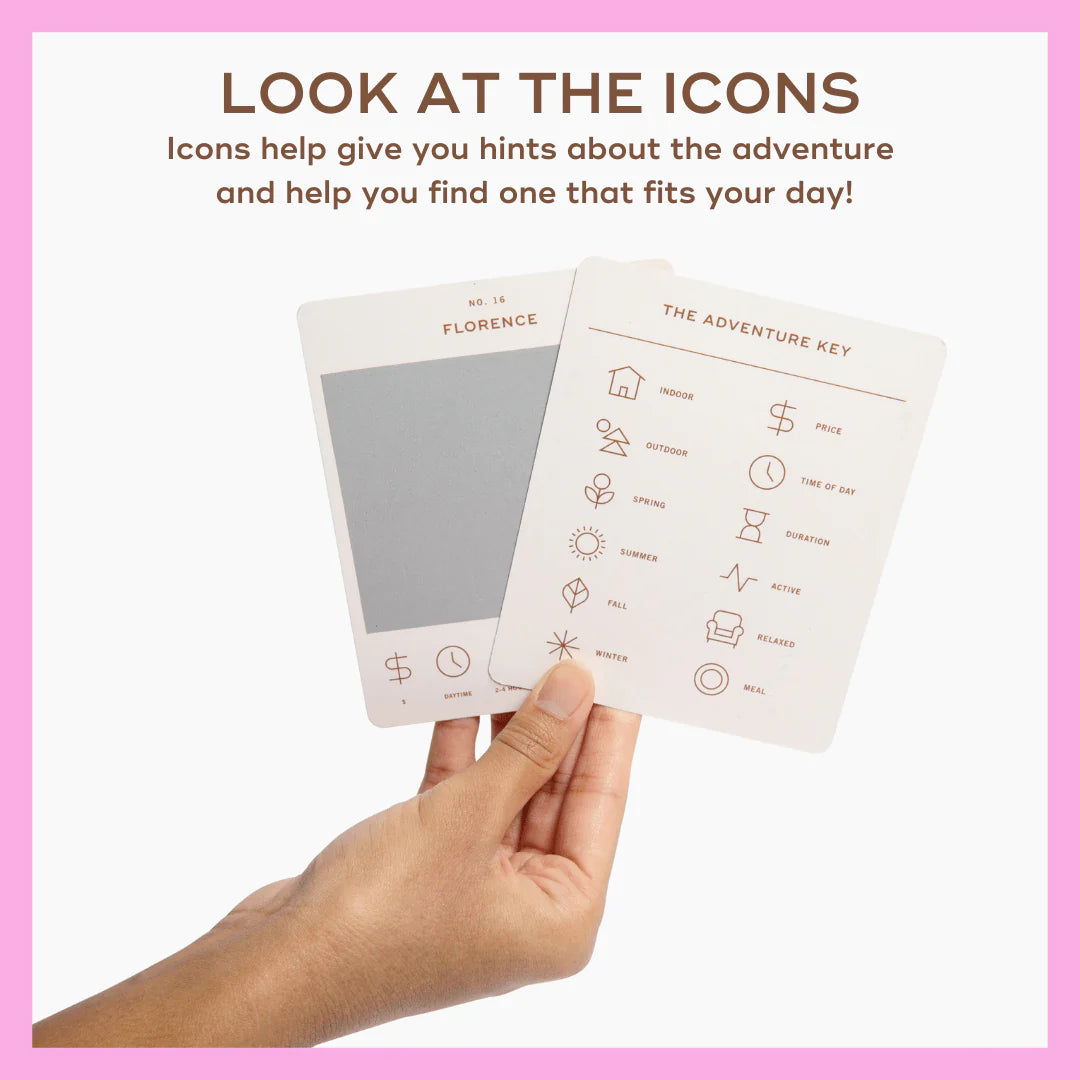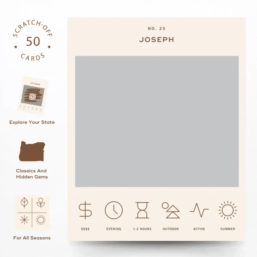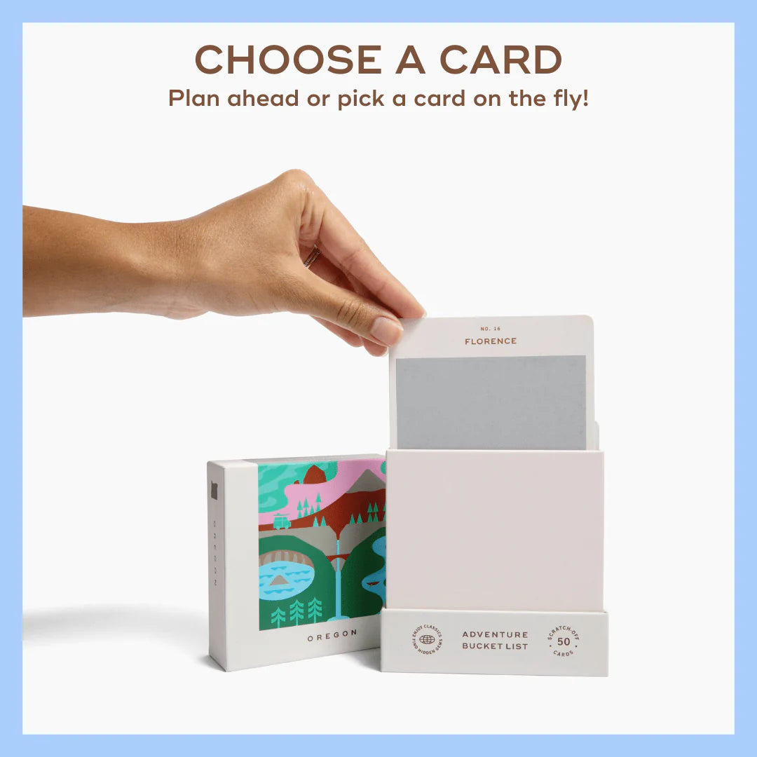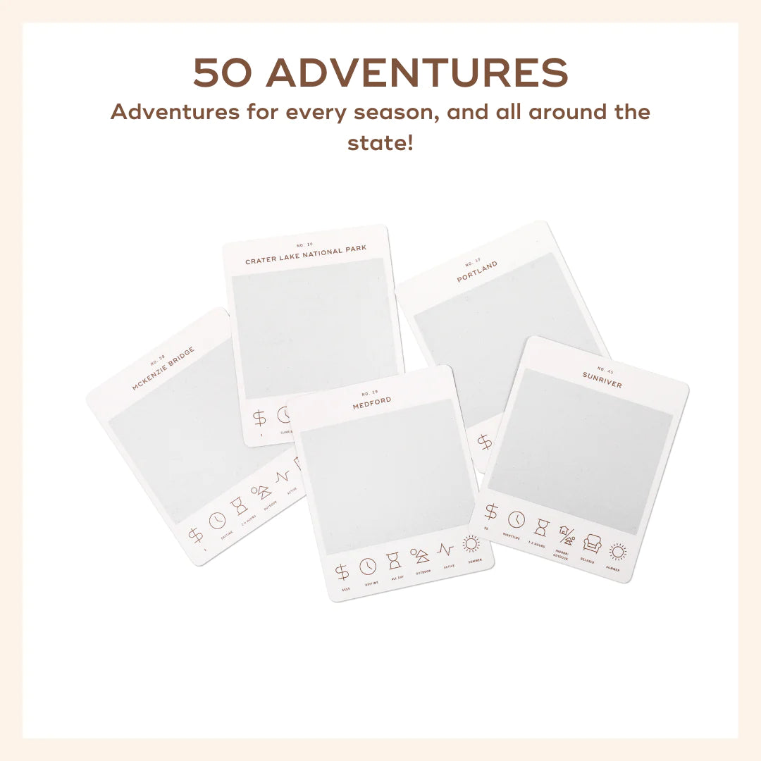 50 scratch off bucket list adventures around the state of Oregon. Pick a city that you want to explore, check out the icons at the bottom of the card to determine the season, cost, and time of day, and then scratch off the card to reveal your adventure!